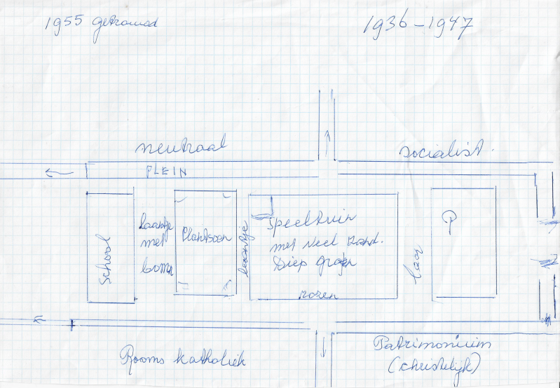Els pakt een tekening van haar oude wijk in Amsterdam-West waar zij woonde van 1936 tot 1947. “Hier linksboven woonden de neutrale mensen, rechtsboven de socialisten, linksonder de Katholieken en rechtsonder de Protestanten.” Het plaatje klopt precies met hoe de verzuiling wordt gepresenteerd in de schoolbanken.